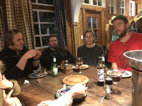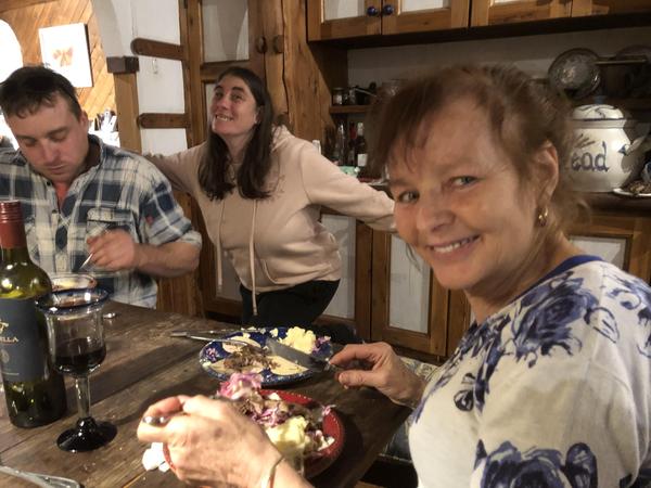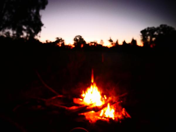 Im Schatten des großen, grauen Eukalyptus zeigt die Sonne mein Camp unter dem Waldrand. Es wird Abend. Sobald die Sonne schwindet, lässt die Kälte nicht auf sich warten. Aber ein wärmendes Feuer erlaubt auch den späten Gästen unverfrorene Stunden. Nur wenig später kommt der ganze Zauber des Feuers zur Geltung. Auch die Strahlen der Sonne über den Kronen der Bäume zeigen das Glimmen ihrer mächtigen Quelle. Bei einem Abendessen im Kreise der Familie teilen sich die Freuden der Gegenwart um so leichter. Hier in der Küche unseres gemeinsamen Anfangs, mein Sohn Bernhard, Telline (unsere Adoptiv Tochter) und Maria, meine geschiedene Frau von 30 Jahren. Wir sind nach wie vor Freunde und Geschwister auf der Ebene einer