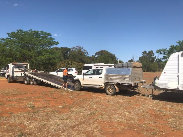 Hier stehe ich also mit dem langen Geschoss. Alles zusammen macht die Kombination eine Länge von über 12 Metern. Halb auf der Straße, rufe ich sofort den australischen Auto Club. Eine freundliche Stimme weist mich in die Regeln ein und sagt einen Abschleppdienst in den nächsten zwei Stunden zu.