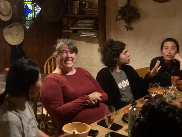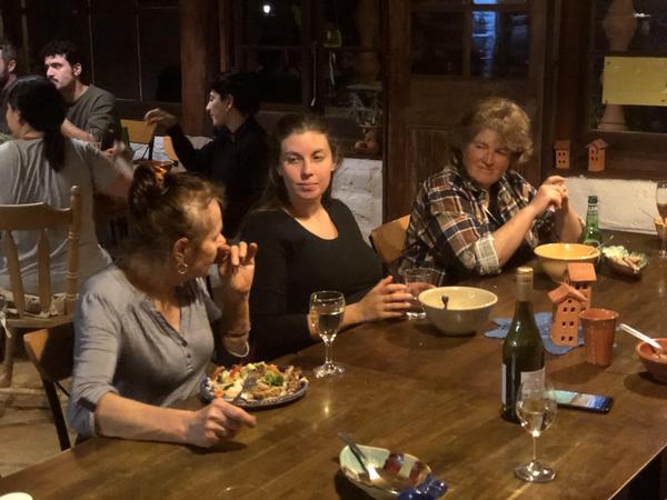 Das lachende Zentrum, Elke, die heutige Lehrerin für den Nachwuchs an Kindern. Wir befinden uns hier am Tisch der Woofer. Vorne Estella und links neben Elke Marta und Rosi. Marta aus Italien und Rosi aus Korea.