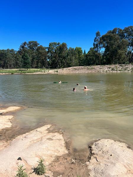 Und hier nochmal das "Wasserloch" in seiner ganzen natürlichen Schönheit. Wer schon einmal vom "Grounding" oder "Earthing" gehört hat weiß, dass negativ geladene Ionen, von der Erde kommend, die elektrische Spannung des menschlichen Körpers ausgleichen können. Dazu gibt es inzwischen Bettlaken und Fußmatten für jene zu kaufen, denen das Barfußlaufen unmöglich bleibt. Das Schwimmen in einem Teich ermöglicht diesen Ausgleich