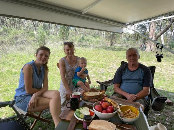 Hier ein Frühstücksbesuch in meiner Wohnwagen-Klausur. Eine natürlich willkommene Abwechslung für ein Leben allein.