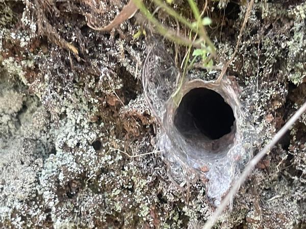 Erst bei genauem Hinsehen werden die kleinen Höhlen der Funnelweb-Spider sichtbar. In Europa haben wir sie im im Gartenboden, wo die Bewohner Kleinstinsekten fangen, damit alles in Balance bleibt.