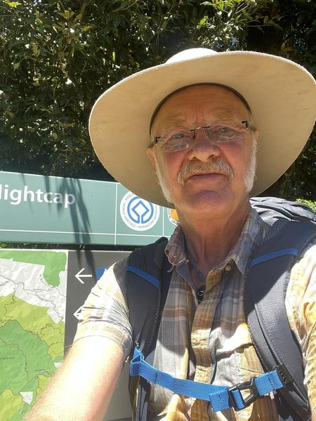 Der Abenteuer bereite Rentner präsentiert sich vor der Karte des großen National Parks "Nightcap", um seine Fähigkeiten zu überprüfen.