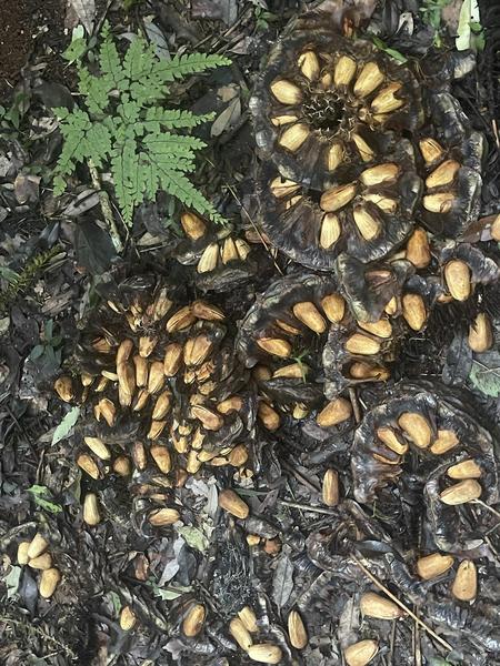 Und hier ein geöffneter Zapfen seine vorher versteckten Schätze anbietend. Die Samenschale ist jedoch so hart, dass wir sie kochen müssen, um eine Öffnung zu erlauben. Bisher fand ich kein Tier, was sich von diesen Samen ernährt.
